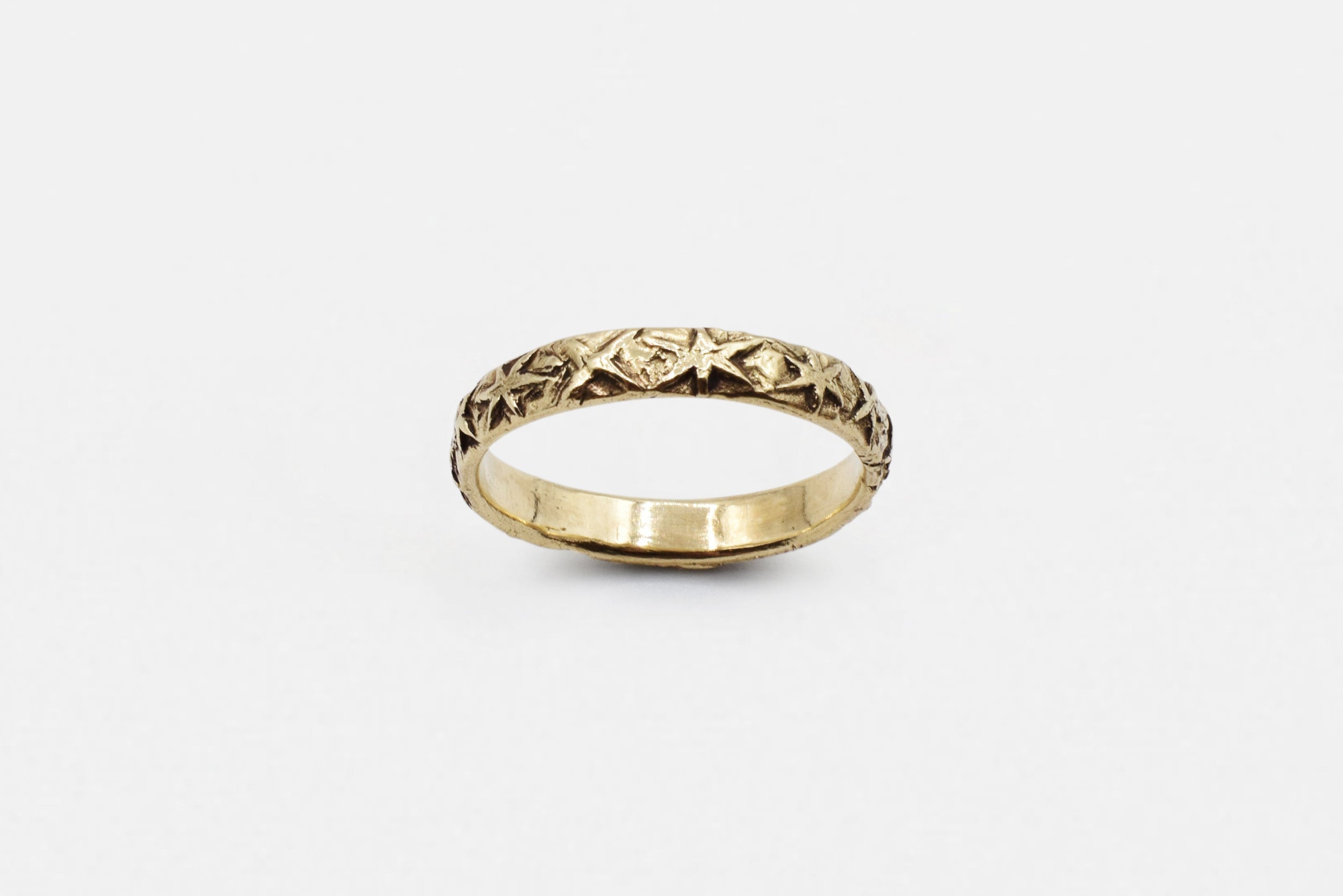 A slim band decorated with raised stars, inspired by a medieval piece. Perfect as an unconventional wedding band, or an everyday ring.
