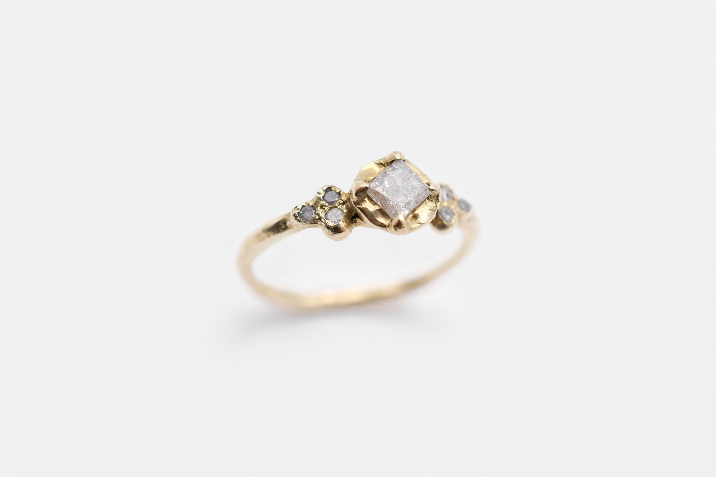 Somewhere safe to carry with you. Central stone is held by hand carved prongs in a golden frame. Set with a glittering square salt and pepper diamond, flanked on either side by six pavé grey diamonds.