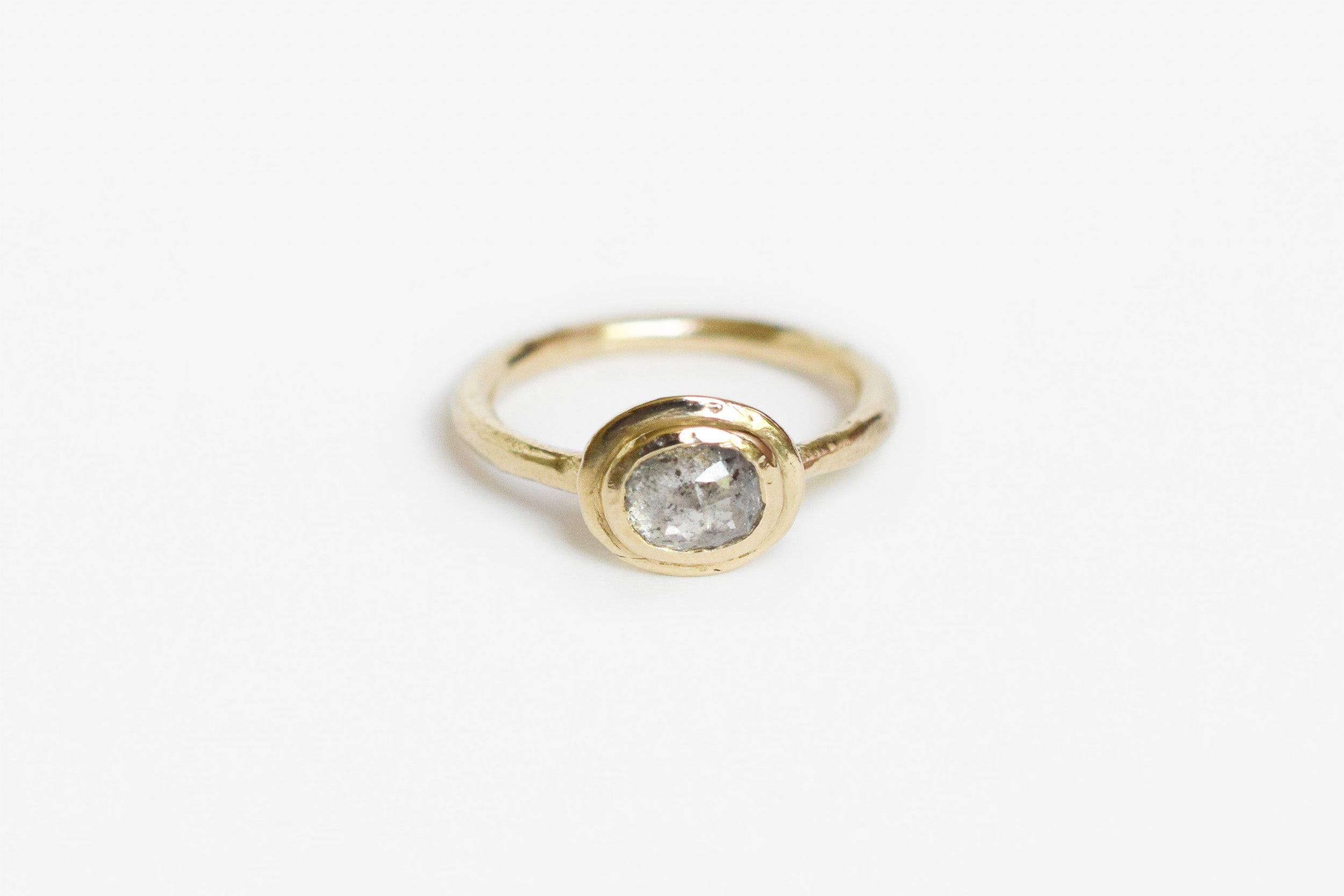An ancient inspired solitaire, in 14k yellow gold. Features a framed bezel surrounding a beautiful rose cut salt and pepper diamond. Wonderfully weighty; a monument for you to wear. Low profile and comfortable for daily wear.