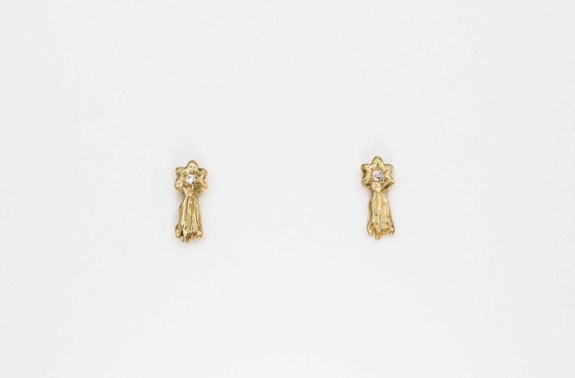£190.00A pair of tiny comets, each bead set with a glittering salt & pepper diamond. Textured gold catches the light wonderfully.