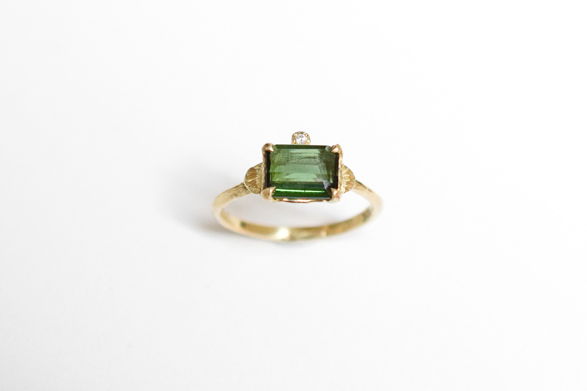 £640.00A striking emerald cut green tourmaline, held in a 9k yellow gold claw setting. Stone is flanked by engraved fan shapes, and wearing a tiny white diamond atop it.